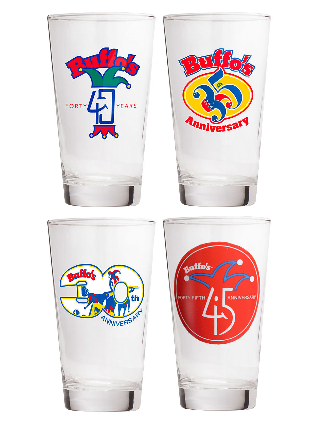 Four 16 oz. souvenir pint glasses commemorating Buffo's 30th, 35th, 40th, and 45th anniversaries.